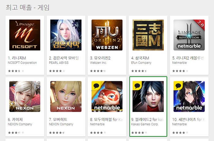 1일 구글플레이 게임 부문 최고매출 순위에 따르면 액션스퀘어가 개발하고 카카오게임즈가 서비스하는 액션 RPG(역할수행게임) '블레이드2 for kakao'가 9위를 차지했다.