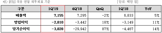 한국채택국제회계기준(K-IFRS)적용 연결 재무제표 기준 1분기 매출액 72억원 영업손실은 약 28억원으로, 서비스 중인 모바일게임 매출 감소에 따라 매출액은 전분기 대비 소폭 감소했다.