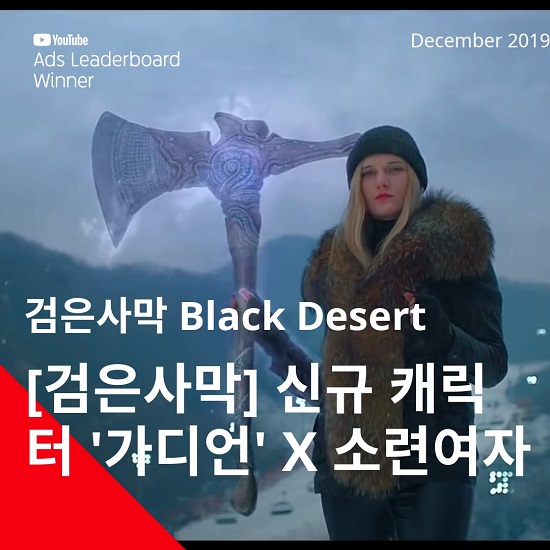 지난 12월 유명 유튜버 ‘소련여자(Soviet girl in Seoul)' 크리스가 참여한 검은사막 신규 캐릭터 ‘가디언’ 광고는 조회수 200만, 좋아요 1만 6000개를 받았다. 유튜브는 매달 가장 많은 사랑을 받은 광고 10개를 Ads Leaderboard에 선정한다.