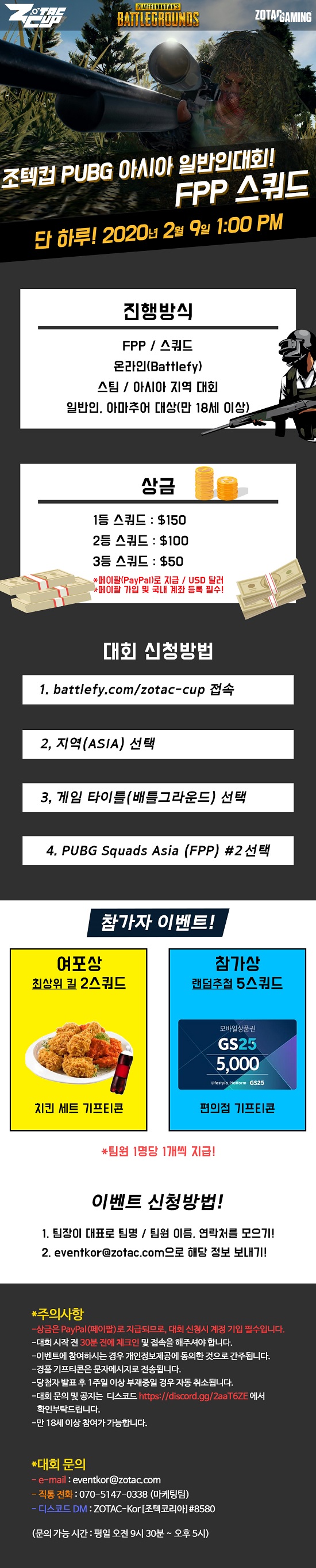 ‘조텍컵 배틀그라운드 스쿼드 아시아 FPP’는 총상금 300달러 (한화 약 35만 원)로 전 세계적으로 인기를 끌고 있는 ‘플레이언노운즈 배틀그라운드(PLAYUNKNOWNS BATTLEGROUNDS)’를 타이틀로 진행한다. 한국 시간 기준 2월 9일 (일) 오후 1시부터 FPP 스쿼드 6라운드 방식으로 단 하루만 진행한다.