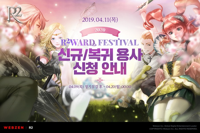 웹젠은 4월 9일(목) ‘R2WARD FESTIVAL 2020’의 티징 페이지를 열고, 서비스 초기부터 R2를 즐겨온 회원들이 다시 한번 즐겁게 게임을 플레이할 수 있도록 4월 20일(월) 00시까지 ‘신규/복귀’ 신청 이벤트를 진행한다.