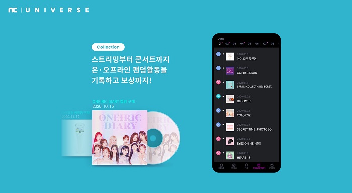 유니버스에서 즐길 수 있는 콘텐츠도 일부 공개됐다. 이용자는 콘서트, 스트리밍 등 온·오프라인 팬덤 활동을 유니버스 앱에 인증, 기록하는 ‘컬렉션(collection)’ 기능을 즐길 수 있다. ‘컬렉션’에 기록한 활동에 따라 다양한 보상이 제공된다.