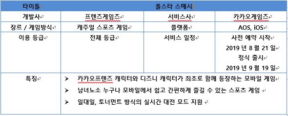 글로벌 멀티플랫폼 게임 기업 카카오게임즈(각자 대표 남궁훈, 조계현)가 2019년 하반기 선보이는 ‘올스타 스매시’는 친근감 넘치는 카카오프렌즈 캐릭터와 세계적인 인기를 누리고 있는 디즈니 캐릭터가 등장하는 모바일 탁구 게임이다.