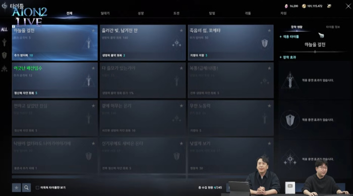 타이틀의 경우, 345개를 마련해놨으며, 일대기, 성장, 도전, 탐험, 격돌, 자원 등 다양한 플레이를 통해 타이틀을 획득하게 된다. 타이틀 역시 장착 효과와 보유 효과가 존재하며 최대 3개 슬롯에 장착할 수 있다.