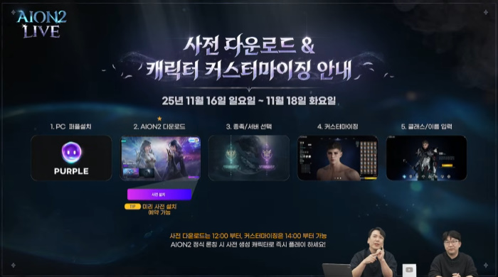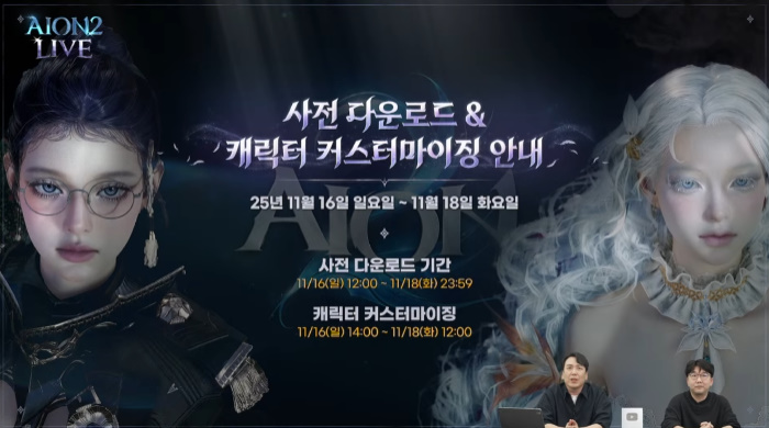 아이온2의 사전 다운로드는 11월 16일 오후 12시부터 가능하며, 사전 캐릭터 커스터마이징은 16일 오후 2시부터 진행할 수 있다. 또 16일에는 기존 서버 수용 인원 증설 및 신규 서버 추가가 이뤄질 예정이다.