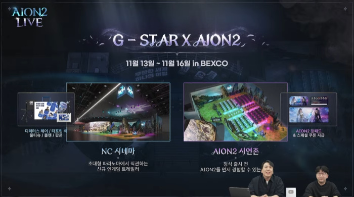 지스타 2025에서는 엔씨 시네마 공간을 마련했으며, 이곳에서는 초대형 파라노마에서 신규 인게임 트레일러를 감상할 수 있다. 또 아이온2 시연존에서는 캐릭터 커스터마이징과 우루구구 협곡 던전 플레이를 직접 체험해볼 수 있는 기회가 주어진다.