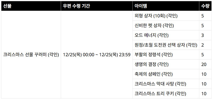 12월 25일 크리스마스 당일 우편함을 통해 '크리스마스 선물 꾸러미'가 지급됩니다. 다양한 보상과 크리스마스 특별 소모품이 함께 지급됩니다.
