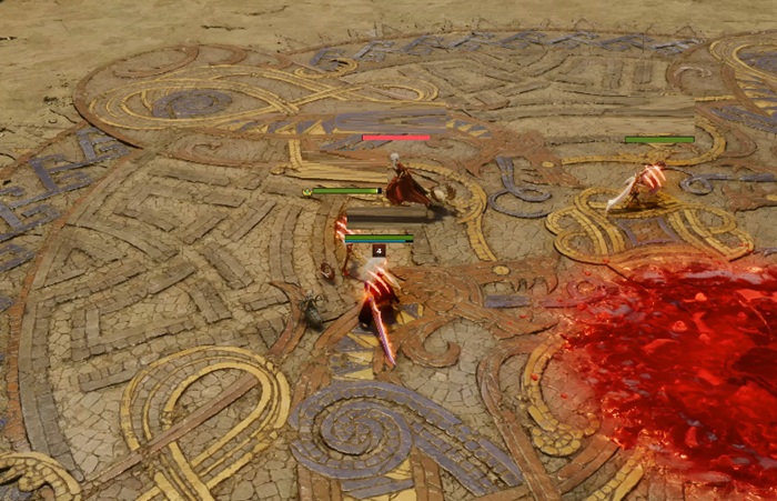 두 번째로 유의해야할 패턴은 파티원 1명 타겟 지속 피해 공격이다. 강령술사 두안카는 파티원 중 1명을 지목, 지속 피해를 주는 장판을 형성한다. 지목 당한 파티원은 이동 불가 상태가 되며, 지속 피해를 풀기 위해서는 모든 파티원이 범위 내에 진입해 함께 피해를 받아줘야 한다.
