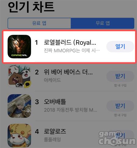 사전예약자 수 100만명을 돌파한 ‘로열블러드’는 지난 9일부터 사전 다운로드를 진행했다. 그리고 10일 현재 실시간 순위가 반영되는 애플앱스토어 인기순위(무료)에서 1위를 기록 중이다.