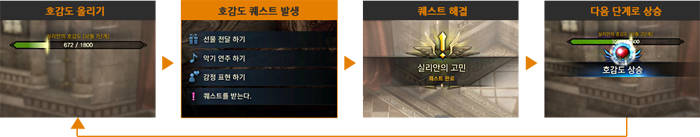 호감도를 올리기 위해서는 선물 전달, 악기 연주, 감정 표현이라는 방법이 존재했다. 이 방법들은 그대로 유지된다. 이번에 개편된 사항 중 가장 중요한 부분은 바로 호감도 퀘스트가 생긴 점이다.