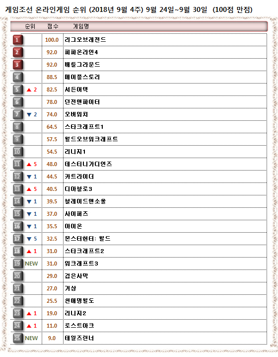 게임조선에서 집계한 9월 4주차 온라인게임을 살펴보면 상위권에서는 '서든어택'과 '오버워치' 각각 2계단씩 오르고 내린 가운데 중상위권에서 많은 변화가 있었다.
