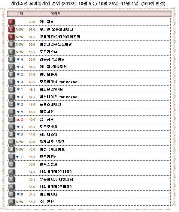 2018년 10월 5주 <게임조선> 모바일게임순위