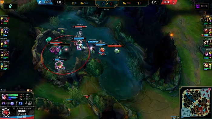 실제로 라인을 밀어넣고 시야를 장악한 뒤 정글러를 동반한 판테온의 대강하가 재미를 보는 그림이 꾸준하게 나왔으며 주요 오브젝트 싸움에서조차 전부 승리하며 FPX가 LPL의 첫 승에 공헌했다.