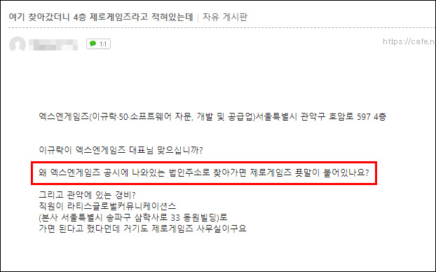 해당 글이 올라오자 공식 카페의 다른 유저들의 제보도 이어졌다. 한 유저는 엑스엔게임즈의 공시 법인 주소(관악구 호암로)를 찾아갔더니 엑스엔게임즈 대신 '제로게임즈'의 명패가 붙어있다고 알린 것. 제로게임즈(대표 박장수)는 작년 8월 출시한 'R0(알제로)'를 개발, 서비스하고 있는 게임사이다.