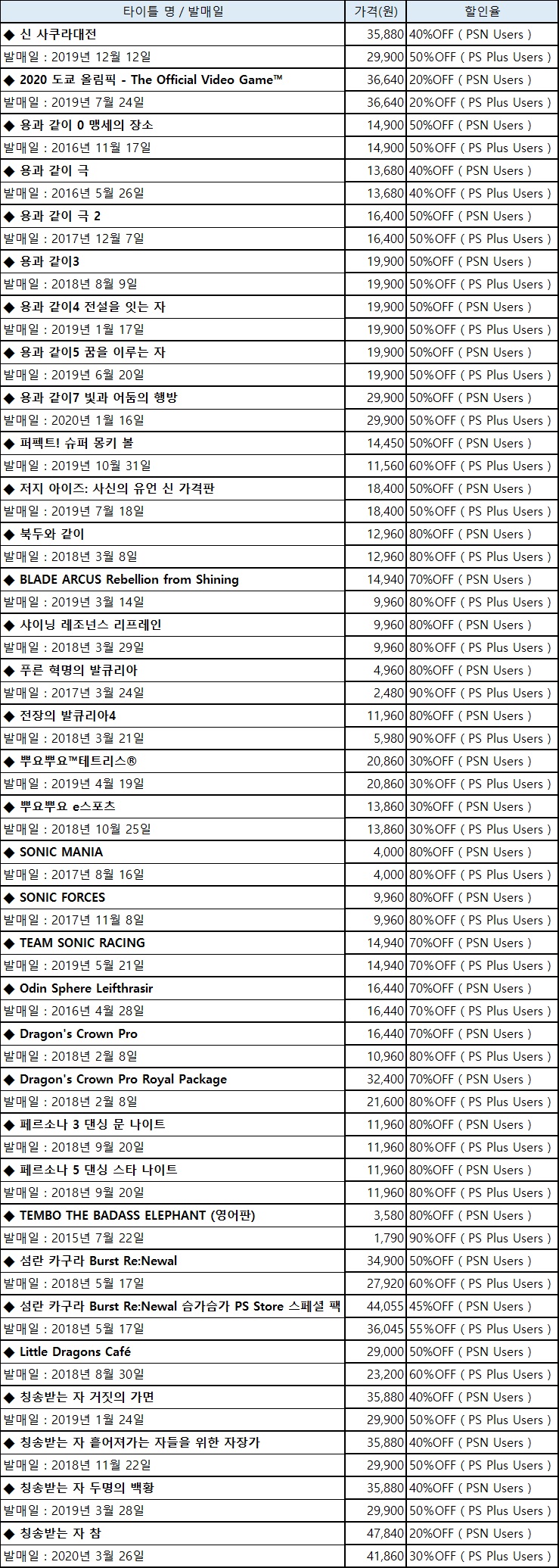 이번 세일의 메인은 최초로 50% 할인 판매되는 ‘용과 같이 7 빛과 어둠의 행방’. 신 주인공 ‘카스가 이치반’의 기용과 RPG로의 장르 변경이 화제를 일으키고 소프트 발매 후 업계 내외에서’압도적으로 재밌다’는 높은 평가를 받은 최신작이다. 그 외 ‘신 사쿠라대전’ ‘저지 아이즈 : 사신의 유언 신 가격판’ ‘Dragon's Crown Pro’, 3월에 발매된 ‘칭송받는 자 참’ 등, 총 40 타이틀 이상이 특별 가격으로 판매된다.