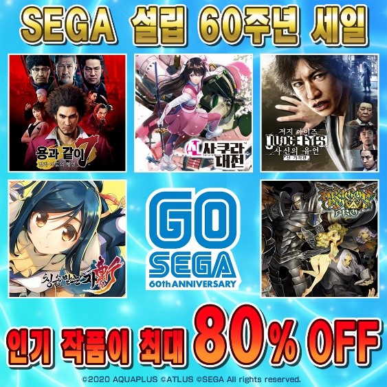 [자료제공 = 세가] 세가는 2020년 6월 3일에 맞이하는 설립 60주년을 기념하여 오늘부터 6월 16일 (화)까지의 기간, PlayStation™Store 및 Nintendo eShop에서 판매 중인 일부 PlayStation®4 / Nintendo Switch™ 전용 타이틀을 특별 가격으로 판매하는 세일을 개최한다. 이 세일은 SEGA Asia의 엄선된 인기작과 명작을 최고의 할인 가격으로 구매할 수 있는 절호의 기회이다.
