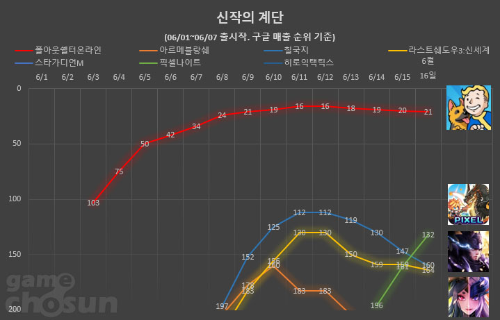 ※ 신작의계단 코너는 [게임조선 편집국]과 게임쿠폰 앱 [게임쿠폰 일일퀘스트] 쪽을 통해 출시 정보가 파악된 타이틀 중 구글플레이스토어 차트에 진입한 타이틀만을 소개합니다. 출시되었으나 언급되지 않은 타이틀이 있다면 제보바랍니다.