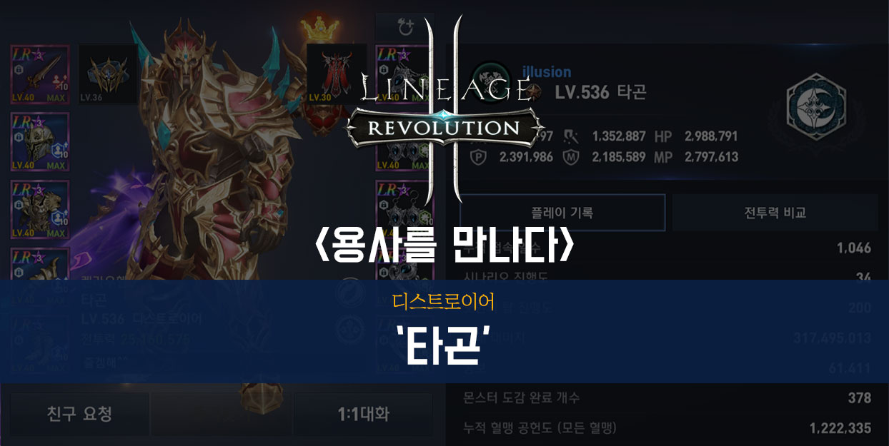 안녕하세요 'illusion' 혈맹에서 남자다운 불의 신 파아그리오를 모시는 오크종족 중에서, 제일 듬직하고 튼튼한 '디스트로이어'를 육성하고 있는 '타곤'이라고 합니다.