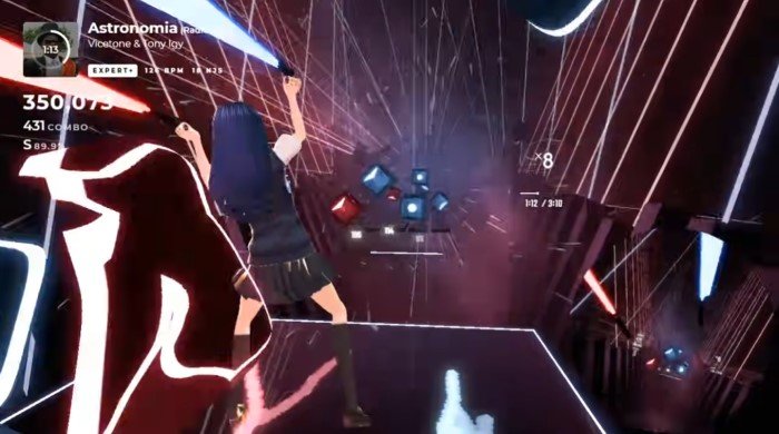 리듬 게임이 아니더라도 VR 게임을 논할 때 절대 빠지지 않는 게임이죠. 바로 '비트 세이버'입니다. 마치 '스타워즈'의 제다이 전사처럼 광선검을 들고 리듬에 맞춰 블록을 베어내는 방식으로 진행하는 리듬 게임입니다.