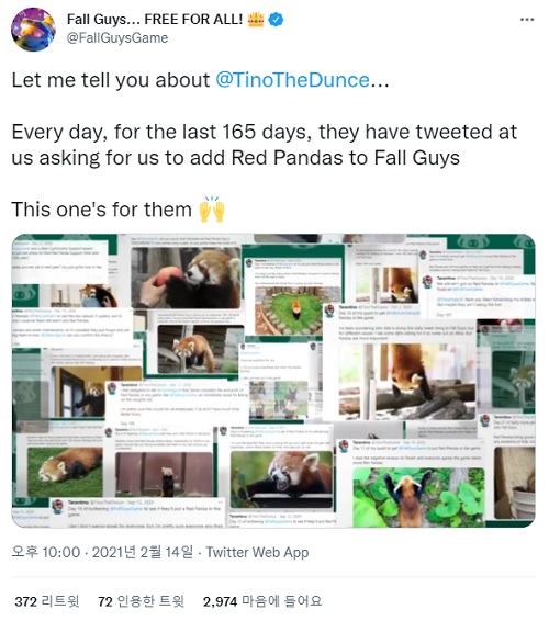 여기에 폴가이즈의 톡톡 튀는 매력에 맞춰 약간은 4차원적인 콘셉트의 공식 SNS 마케팅과 콜라보레이션 행보로 폴가이즈만의 매력을 완성시켰다고 할 수 있다. 폴가이즈는 게임 플레이를 통해서 폴가이즈의 설정이나 스토리 등을 확인할 수는 없으나, 공식 소통 채널을 통해서 플레이어들과 폴가이즈만의 이야기를 생산해내면서 색다른 재미를 제공한다.