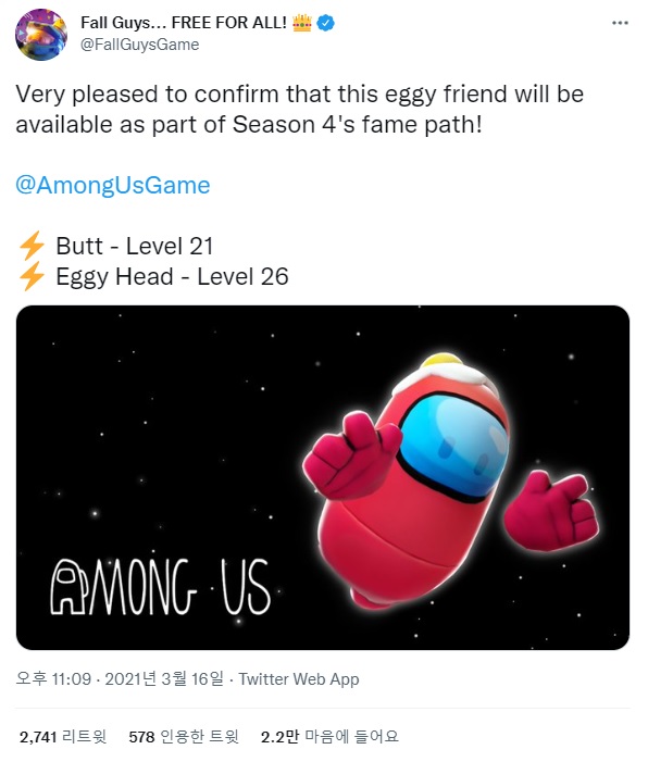 이외에도 인터넷 상에서 폴가이즈와 '어몽 어스'의 엮은 다양한 2차 창작물이 등장하자, 어몽 어스와의 콜라보 스킨을 선보이면서 플레이어들의 뜨거운 사랑에 화답했다.