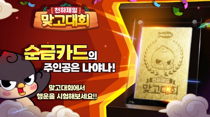 모바일 웹보드 게임 피망 뉴맞고’는 ‘다시 돌아온 골드러시 이벤트’를 오는 26일부터 10월 17일까지 진행한다. 맞고 대회에 참여한 횟수 만큼 이벤트에 자동 응모되며, 5명을 추첨해 ‘순금카드 세트’를 지급한다. 당첨자는 10월 25일에 발표된다. 또, 맞고 대회 누적 참여 수에 따라 ‘초대박복권’, ‘슈퍼스타도리’, ‘러블리츄츄’ 등 인게임 아이템을 지급하며, 첫 참여 및 입상, 우승 시에는 게임 머니를 추가로 증정한다.