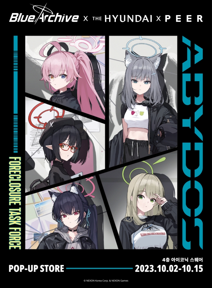 이번 팝업스토어는 현대백화점 판교점 4층 아이코닉스퀘어에서 스트리트웨어 편집숍 피어(PEER)와의 협업 하에 진행된다. 스트리트웨어 분위기로 재해석된 ‘아비도스 대책위원회’ 학생들의 색다른 모습과 ‘모모프렌즈’ 스페셜존, ‘KAITEN-Fx Mk.0 프라모델’과 ‘페로로지라’의 인게임 전투 장면을 감상할 수 있는 특별존 등 다양한 이색 공간으로 꾸며진다.