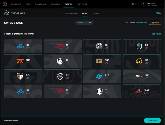 16강으로 진행되는 스위스 스테이지는 2023년 롤드컵에 새롭게 도입된 방식이다. 직행한 14개 팀과 플레이-인 스테이지를 통과한 2개 팀이 모두 참가하며 승패가 같은 팀끼리 대결을 펼친다. 3승을 먼저 거둔 팀은 8강에 진출하며 3패를 먼저 당한 팀은 탈락한다. 3승을 먼저 따낼 것 같은 팀을 다른 팀들보다 위로 끌어다 놓으면 선택이 완료된다. 스위스 스테이지에 대한 예측은 10월 16일(월) 0시부터 시작하며 10월 19일(목) 오후 2시까지 진행된다.