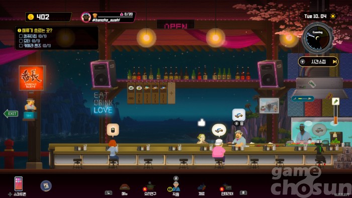 데이브 더 다이버의 '재미'를 구체적으로 하나씩 살펴본다면 아마 이렇게 대답할 수 있을 것이다. 데이브 더 다이버는 왕년에 다이빙을 즐겼던 아저씨 데이브가 독보적인 행동력을 가진 사업가 코브라와 만나 주방장 반쵸와 함께 초밥집을 운영하는 게임이다. 게이머는 데이브가 되어 낮에는 근해부터 심해까지 다양한 모습을 보여주는 수수께끼의 바다 블루홀에 들어가 물고기들을 잡고, 밤에는 이렇게 모은 물고기로 초밥을 만들고, 손님을 대접하는 방식으로 게임을 진행한다. 여기에 흥미로운 스토리를 얹고, 유쾌한 연출을 넣고, 끝없이 이어지는 미니 게임을 제공하고, 총기 제작과 다이빙 장비 개선 등 RPG 요소 등을 더했더니 정가 24,000원이라는 가격에 40시간 이상의 플레이 타임을 보장하는 게임이 튀어나왔다. 이러니 게이머들은 물론 전문가들까지 사랑해 마지않는 '갓겜'이 탄생했다.