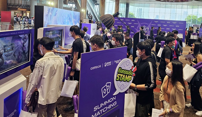 [자료제공 = 컴투스] ‘서머너즈 워 월드 아레나 챔피언십2023(SWC2023)’ 월드 파이널 현장을 찾은 태국 현지 관객들이 경기 관람에 앞서 다양한 이벤트에 참여하며 대회 열기를 뜨겁게 달구고 있다.