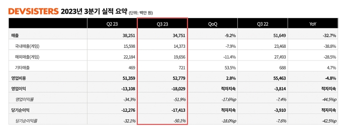[자료제공 = 데브시스터즈] 데브시스터즈(공동대표 이지훈, 김종흔)가 6일 K-IFRS 연결기준 2023년도 3분기 잠정 실적을 발표했다. 2023년 3분기 매출액은 348억 원, 영업손실 180억 원, 당기순손실 174억 원을 기록했다.