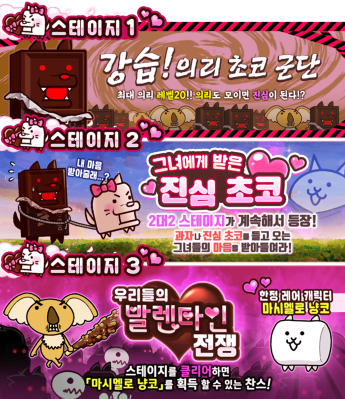 발렌타인 이벤트 한정 다양한 기간 한정 스테이지가 개최된다. ‘강습! 의리 초코 군단’은 클리어할수록 강해지는 적을 상대할 수 있으며, 스테이지 레벨은 최대 20이다. ‘그녀에게 받은 진심 초코’는 2대2로 싸우는 특수한 스테이지로, 냥코 티켓 등 다양한 아이템을 획득 가능하다. ‘우리들의 발렌타인 전쟁’은 클리어하면 한정 캐릭터 ‘마시멜로 냥코’를 극히 드문 확률로 얻을 수 있다.