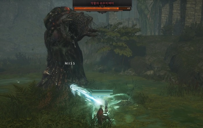 다음으로 주의해야할 패턴은 바로 '오물 브레스'다. 오물 브레스는 전방으로 발사되는데, 브레스 범위를 벗어나면 피해를 입지 않을 수 있다. 오물 브레스 또한 패턴 사전 준비 동작이 있는데, 슈므치 마더가 늪에 머리를 박는 것으로 패턴 파악이 가능하다.