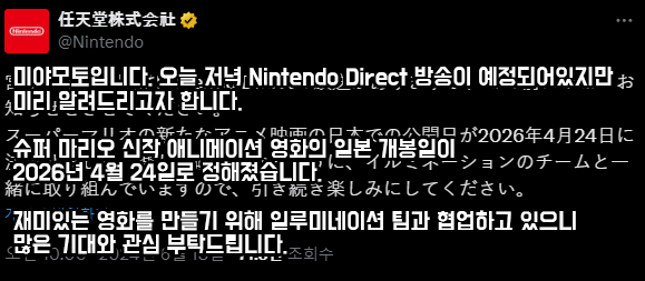 닌텐도는 18일, 공식 트위터를 통해 일루미네이션 엔터테인먼트와 공동 제작 중인 영화 '슈퍼 마리오 브라더스 속편(가제)'의 일본 개봉일을 2026년 4월 24일로 확정 지었다.