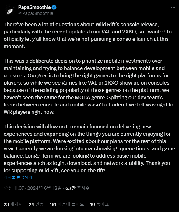 와일드 리프트의 총괄 프로듀서를 역임하고 있는 '파파스무디' 데이비드 쉬는 오늘 본인의 트위터를 통해 공식적으로 콘솔 버전 와일드 리프트의 출시를 중단하게 된 배경에 대해 설명하였다.