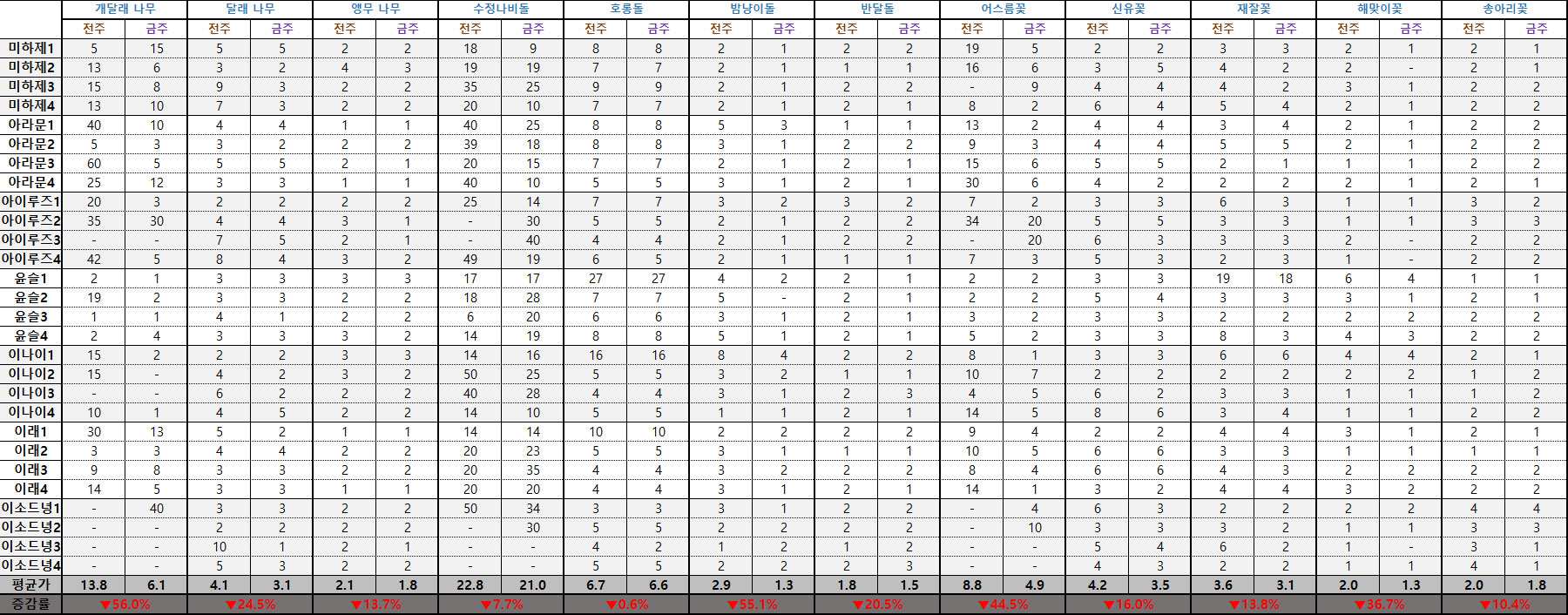 최상위 특산물인 '개달래 나무'가 56% 가량 시세가 하락하면서 전 서버 실시간 최저가 평균 6.1 다이아에 거래되고 있다. 또 '어스름꽃'도 약 44% 정도 가격이 낮아지면서 평균 5 다이아 선을 형성했다.