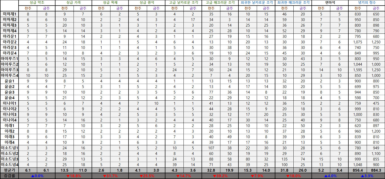 특산물을 비롯해 대부분의 일반 재료 가격 하락세가 계속 이어지고 있다. 특히 '개달래 나무'와 '밤냥이돌'은 큰 폭으로 가격이 떨어졌으며, '고급 매끄러운 조각'도 개당 30 다이아 가격 선이 붕괴되고 개당 약 20 다이아까지 시세가 하락했다. 반면에 '연마석'과 '냉기의 정수'는 가격이 소폭 증가했다.