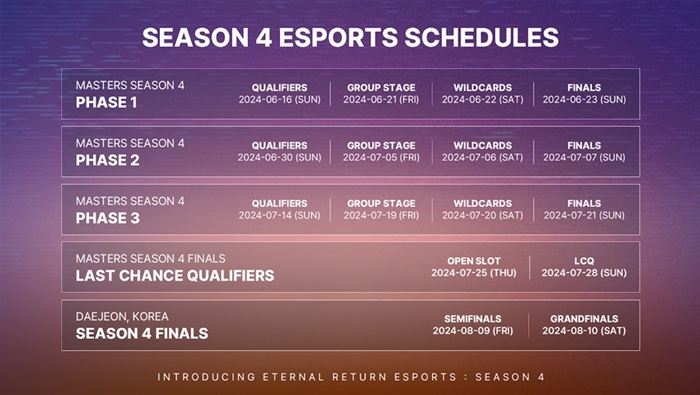 마스터즈 페이즈1은 6월 21일부터 진행된다. 지난 5월 킨텍스에서 열린 이터널 리턴 시즌3 파이널에서 우수한 성적을 거둔 8개 팀은 시드권을 인정받아 예선 없이 각 페이즈에 참여하며, 지난 16일 온라인으로 진행된 예선을 통해 올라온 8개 팀과 3일간 경기를 펼친다.