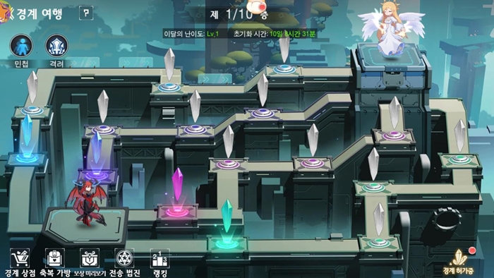 매월 1일 초기 난이도가 재설정되는 '경계 여행' 콘텐츠가 추가된다. 총 10층으로 구성되며, 각 층마다 4개의 경로가 있어 원하는 경로를 선택할 수 있다. 각 경로에는 고정된 직업의 수사관만 배치할 수 있지만, 보스 전투에는 제한이 없다. 일반 전투를 통과하면 보상을 얻을 수 있으며, 보스 전투는 난이도와 별점을 선택할 수 있다. 보스 전투는 이전에 획득하지 못한 별점 보상을 얻기 위해 반복 도전할 수 있다. 경계 여행을 초기화하면 일반 전투의 난이도가 무작위로 증가하며, 통과 시 특별한 축복 효과를 얻을 수 있다.