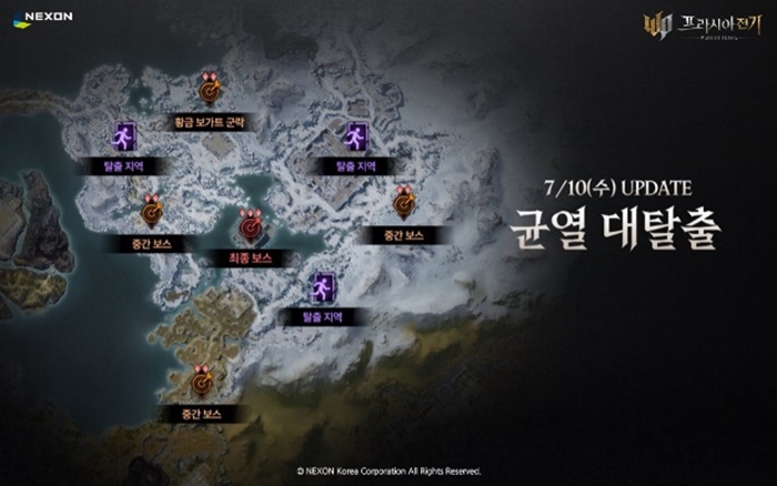탈출 성공 시 획득한 던전 포인트는 ‘균열의 결정석’으로 교환 가능하며, 교환소에서는 ‘압제자 장비 인장’, ‘영웅 장비 인장’, '파도세계 증표’ 등 다양한 보상을 획득할 수 있다. ‘균열 대탈출’은 여름 기간 한정 콘텐츠로 오는 7월 10일부터 9월 23일까지 플레이 가능하다.