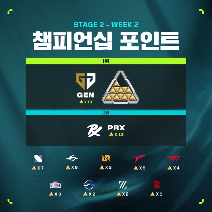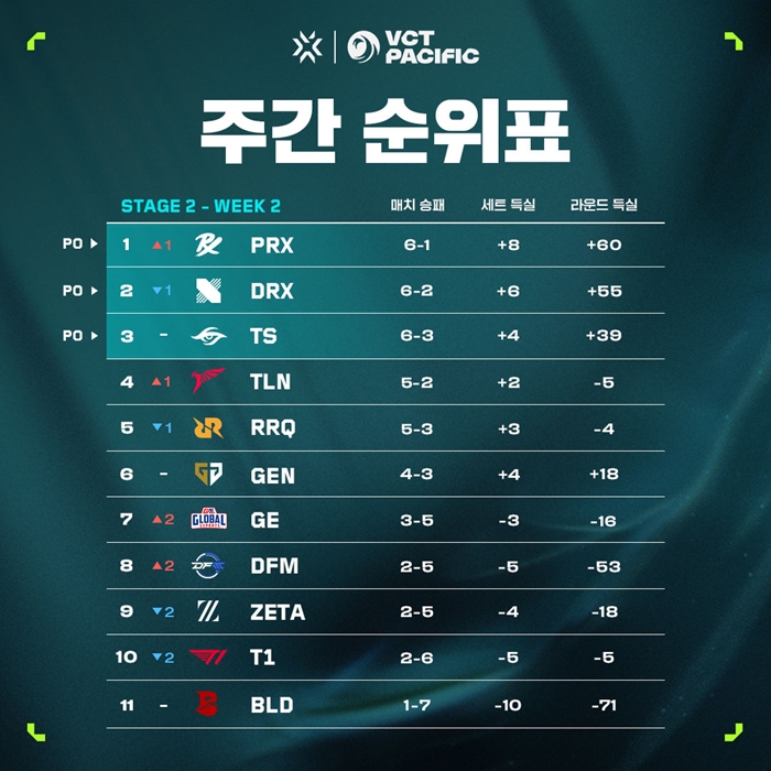 DRX는 2연패를 당했지만 6승2패를 기록하면서 2위에 랭크됐다. 반면 T1은 2주 차에서 승수를 쌓지 못하며 10위로 떨어졌다.