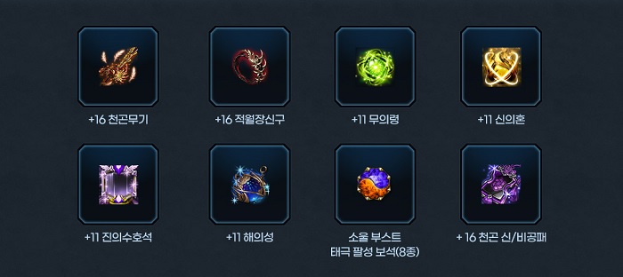 메가 소울 부스트는 빠르면 하루 만에 모든 미션을 완주할 수 있으며 최대 3개 캐릭터를 성장시킬 수 있는 기회와 파격적인 보상이 주어진다. 메가 소울 부스트 완주 보상으로는 '+16 천곤무기 및 적월장신구'와 '+11 무의령, 신의혼, 진의수호석, 해의성', 그리고 '소울부스트 태극팔성 보석(8종)', '+16 천곤 신/비공패' 등이 있다.