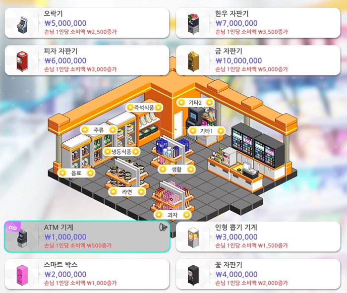 유저는 일주일 단위로 영업을 진행하며 정기적으로 수입을 얻을 수 있다. 수입은 모두 편의점 계좌로 이체되며, 얻은 수입으로 편의점 판촉을 위한 다양한 물품을 구매, 설치할 수 있다.