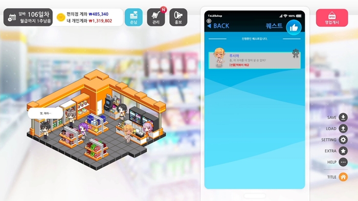 편의점을 방문한 손님으로부터 퀘스트를 받아 새로운 가판대나 보상을 받아보자