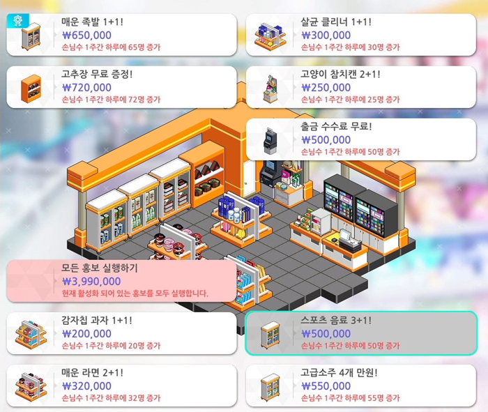 새로운 가판대를 설치했을 때 새로운 홍보활동도 해금되므로 꾸준히 가판대 종류를 늘려가는 것도 편의점 매출 증대를 위한 포인트 중 하나다.