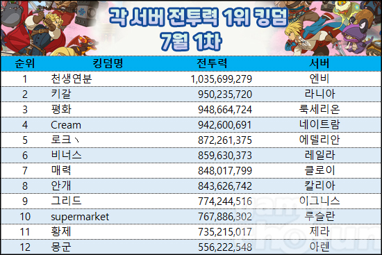 7월 1차 킹덤 랭킹 전 서버 1위는 3주 연속 엔비 서버 천생연분 킹덤이다. 천생연분 킹덤의 전투력은 10억 3,569만 9,279로 지난 랭킹 대비 3,228만 9,748 상승했으며, 2위 라니아 서버 '키갈' 킹덤과 차이는 8,546만 3,559로 더 늘어났다. 예상대로 독보적인 1위를 이어가는 중이다.