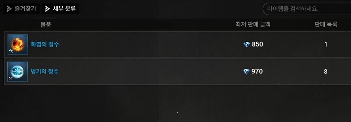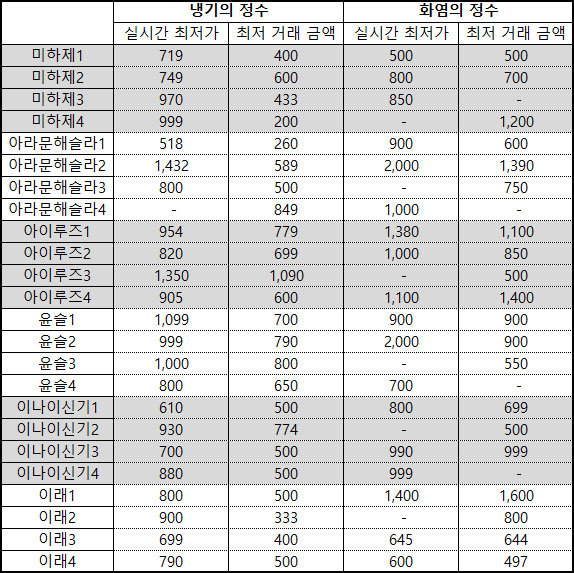 일부 서버에서는 냉기의 정수보다 화염의 정수 가격이 더욱 저렴한 것으로 나타났다. 미하제1 서버에서 냉기의 정수는 650다이아에 물품이 등록된 반면, 화염의 정수는 580다이아에 아이템이 올라왔다. 또 미하제3 서버와 윤슬1, 윤슬4 서버, 이래3. 4서버도 냉기의 정수보다 화염의 정수가 낮은 가격에 물품이 등록됐다.