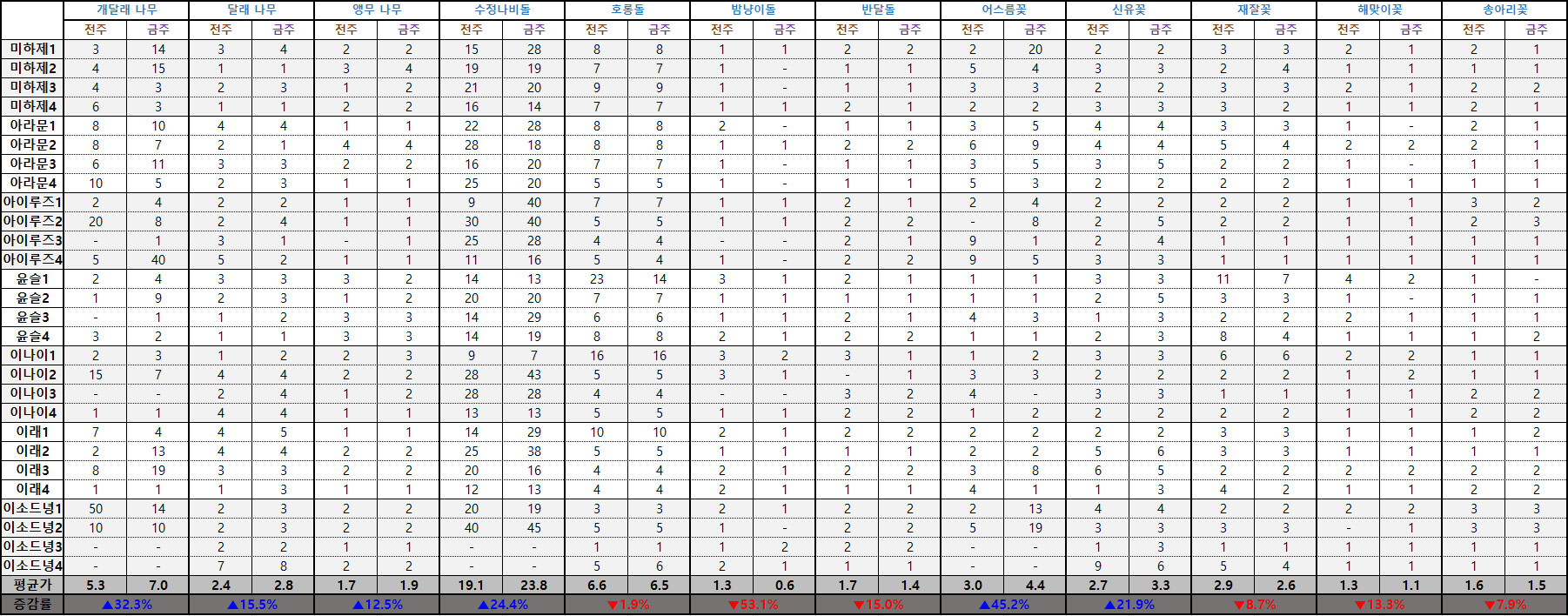개달래 나무와 달래 나무, 앵무 나무 등 목재류 특산물의 시세가 일제히 상승했다. 특히 개달래 나무는 지난주 대비 32.3% 가격이 상승하면서 전체 서버 평균 개당 7 다이아에 거래되고 있는 중이다.