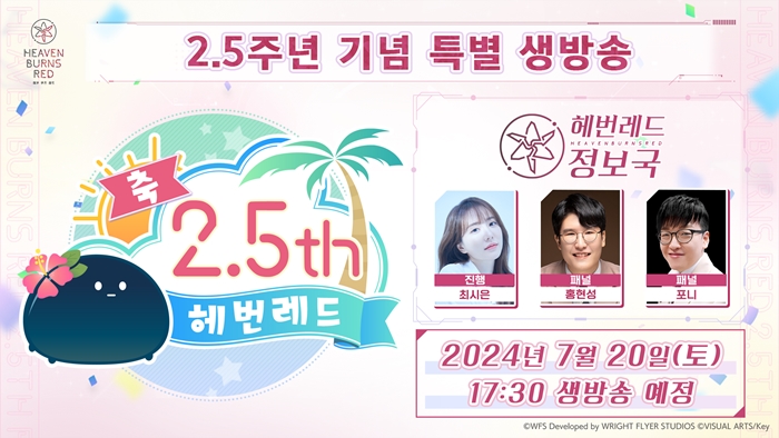 헤븐 번즈 레드 2.5주년을 기념하여 2024년 7월 20일(토) 17:30부터 한국 공식 유튜브 채널을 통해 '2.5주년 기념 특별 생방송'을 진행한다.