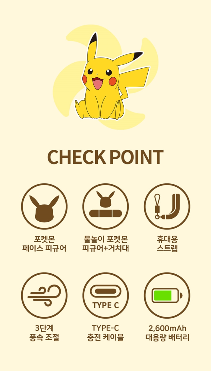 포켓몬 튜브 선풍기는 본체 가운데 위치한 전원 버튼을 클릭하여 간단하게 전원 온/오프가 가능하며, 상황에 따라 3단계로 풍속을 조절하여 최적의 바람 세기를 선택할 수 있다. 그리고 2,600mAh 대용량 배터리가 내장되어 있어 1회 완충 후 외출 시 배터리 걱정 없이 최장 8시간까지 시원함을 유지하면서 사용 가능하며, 측면의 Type-C USB 충전포트를 통해 다양한 환경에서 충전할 수 있다. 또한 충전 편의성 및 휴대성을 위해 USB 케이블과 스트랩도 제품에 기본으로 제공된다.